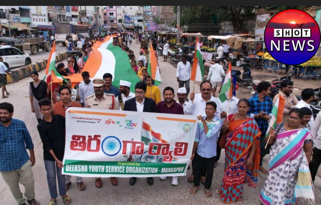 ప్రకాశం జిల్లా మార్కాపురం పట్టణంలో ఈరోజు మధ్యాహ్నం 2:30 కి దీక్ష యూత్ సర్వీస్ ఆర్గనైజేషన్ మరియు సబ్ కలెక్టర్ వారి సంయుక్తంగా 100 అడుగుల జాతీయజెండాతో తిరంగా ర్యాలీ నిర్వహించారు. ఈ ర్యాలీని సబ్ కలెక్టర్ కార్యాలయం సబ్ కలెక్టర్ సెహదిత్ వెంకట త్రివినాగ్ ప్రారంభించారు. ఈ కార్యక్రమంలో సీఐ పి సుబ్బారావు, తహసీల్దార్ చిరంజీవి, మున్సిపల్ కమిషనర్ నారాయణ రావు, డిప్యూటీ డిఇఓ సిఐ సుబ్బారావు, దీక్షా యూత్ సర్వీస్ ఆర్గనైజేషన్ అధ్యక్షులు సాయి సుబ్బారావు, రెవిన్యూ సిబ్బంది, తదితరులు పాల్గొన్నారు.