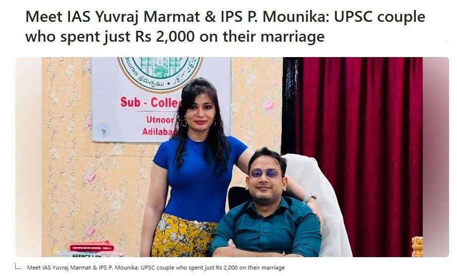 జీవితంలో ఒక్కసారి చేసుకునే వేడుక… గుర్తుండిపోవాలి అంటూ రూ.లక్షలు, కోట్లు పోసి మరీ పెళ్లిళ్లు జరుపుకొంటున్నారు. ఇందుకు పేద, ధనిక అన్న తేడా లేదు. అలాంటిది ఇద్దరు సివిల్ సర్వెంట్ల పెళ్లంటే ఎంత ఘనంగా జరగాలి? కానీ వాళ్లు పెళ్లికి ఖర్చు పెట్టిందెంతో తెలుసా? రూ.2 వేలు.ఐపీఎస్ ఆఫీసర్ మౌనికది తెలంగాణ కేడర్. ఐఏఎస్ ఆఫీసర్ యువరాజ్ మర్మత్ ది ఛత్తీస్ గఢ్ కేడర్. మౌనిక ఫార్మకాలజీ పూర్తిచేసి, సివిల్స్ వైపు వెళ్లారు. యువరాజ్ రాజస్థాన్. ఈయన సివిల్ ఇంజినీరింగ్ పూర్తిచేసి, కొన్నాళ్లు ఇండియన్ ఆయిల్ కార్పొరేషన్లో ఉద్యోగమూ చేశారు. తరవాత కొలువుకు రాజీనామా చేసి,సివిల్ సర్వీసెస్ సాధించారు. ఇద్దరూ 2022 బ్యాచ్కు చెందినవారే. ముస్సోరిలోని లాల్ బహదూర్ శాస్త్రి నేషనల్ అకాడమీ ఆఫ్ అడ్మినిస్ట్రేషన్లో శిక్షణ తీసుకుంటున్న సమ యంలో ఇద్దరికీ పరిచయం ఏర్పడింది. అది ప్రేమగా మారి 2023లో పెళ్లి పీటలెక్కారు. అయితే తమ పెళ్లి హంగు, ఆర్భాటాలకుదూరంగా ఉండాలని కోరుకున్నారిద్దరూ. బ్యాండు బాజా, ఖరీదైన రిసెప్షన్, వేలమంది జనాల మధ్య కాదు… అయిన వాళ్ల మధ్య సింపుల్గా చేసుకోవాలని భావించారు. కాబట్టే, కుటుంబసభ్యులు, స్నేహితులు, సహాధ్యాయుల మధ్య కోర్టు మ్యారేజ్ చేసుకున్నారు. రిజిస్ట్రే షన్, పూలదండలు, స్వీట్లకు అయిన ఖర్చు రూ. రెండు వేలే. తాజాగా తమ రెండో వివాహ వార్షికోత్సవం సందర్భంగా ఆ క్షణాలను గుర్తుచేసుకుంటూ మౌనిక ఇన్స్టాలో ఓ రీల్ పెట్టారు. అదికాస్తా నెటిజన్లను ఆకర్షించడంతో వైరలైంది. పెళ్లంటే నిబద్ధత, కలకాలం తోడుం టామని చేసుకునే బాస… అంతేకానీ అనవసర ఖర్చు కాదు. అది నిరూపిస్తున్న వీళ్లు అందరికీ ఆదర్శమంటూ నెటిజన్లు కితాబులూ ఇస్తు న్నారు. వాళ్ల ప్రయత్నం నిజంగానే అభినంద నీయం కదూ!